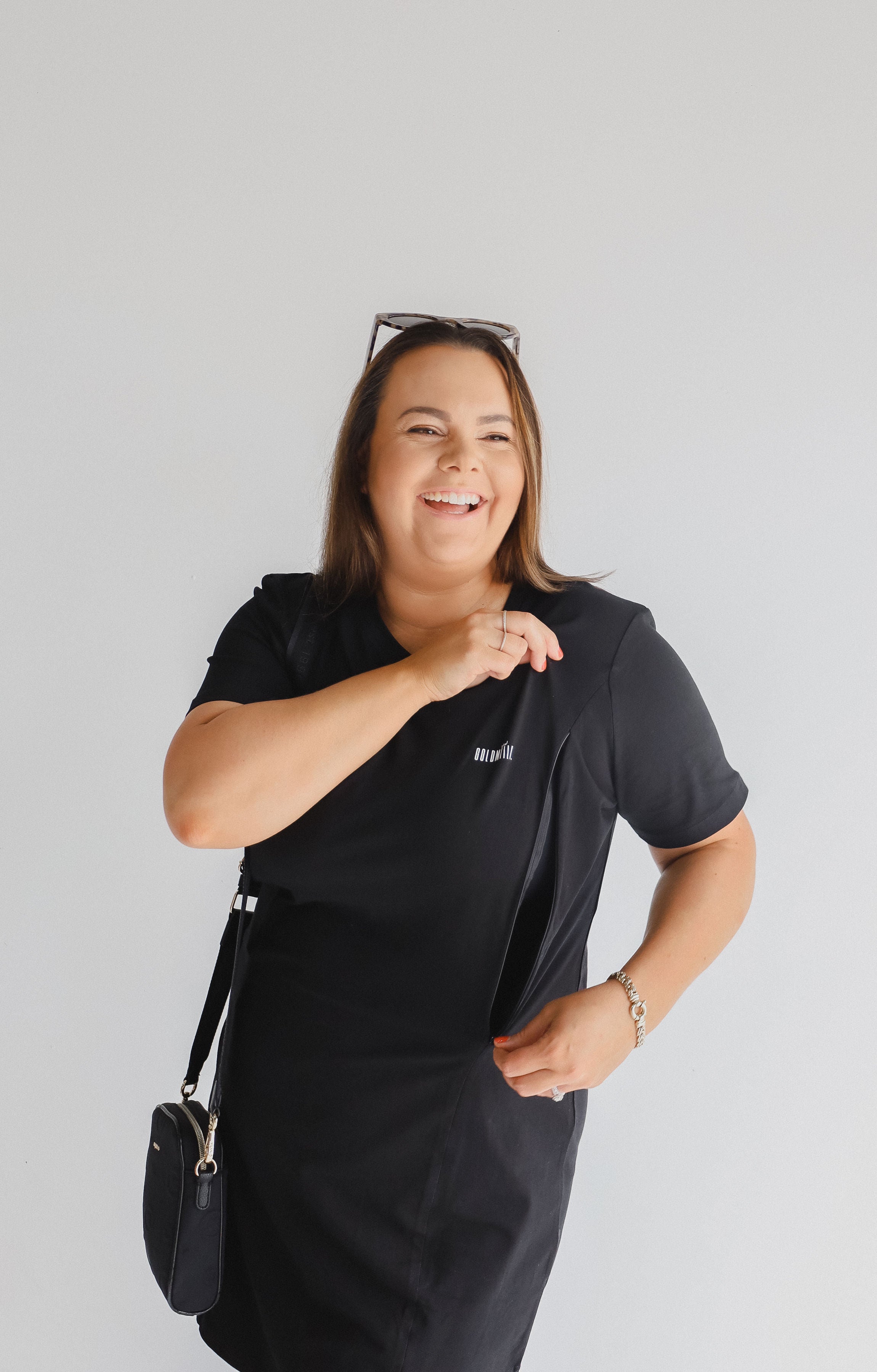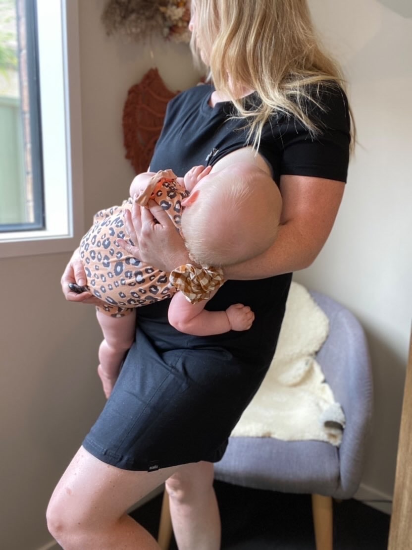 "I recently purchased the black breastfeeding dress, white lady shirt and water bottle. I love my purchases!! The fit of the dress is super comfortable, great length and zips are in an ideal spot for easy feeding."